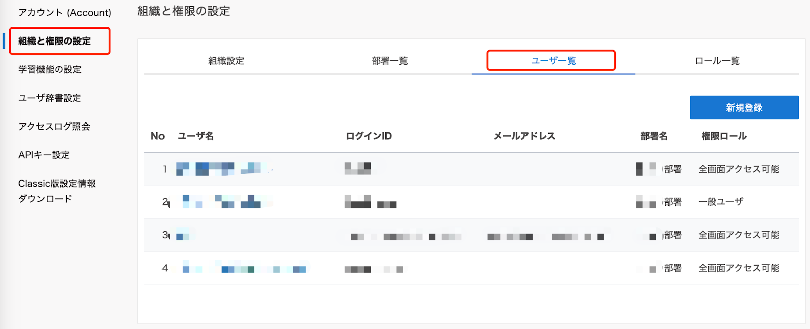 - ユーザを新規に登録する場合は「新規登録」をクリックします。